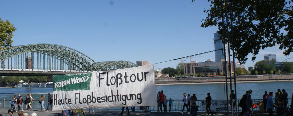 Seit Freitag Nachmittag liegen wir nun schon in Köln und sind schwer beschäftigt mit Informationsarbeit und Floßbesichtigungen. Viele der Wochenendspaziergänger*innen finden unser Floß interessant, wollen es sich angucken und lassen sich gerne auf Gespräche zum Thema Flugverkehr und über Robin Wood ein. Das Thema Flugverkehr beschäftigt viele Menschen. Es wird deutlich dass wir selbst die Veränderung sein müssen die wir in der Welt sehen wollen und unsere Flugreisen aufgeben beziehungsweise drastisch reduzieren müssen, dass dies aber lange nicht ausreicht und wir eine gesamtgesellschaftliche Verkehrswende hin zum Ausbau von Fahrradwegen, der Förderung öffentlicher Verkehrsmittel und dem Rückbau von Flughäfen brauchen.