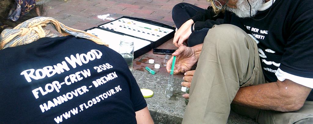 Heute sind wir, wegen angeregten nächtlichen Diskusssionen über die Tierproduktion mit Mitgliedern des Yachthafens und überraschendem Regen in der Nacht, müde aufgewacht. Doch um zwölf Uhr waren wir wieder unterwegs, um in Hoya Passant*innen über die ökologischen Folgen der Tierprduktion zu informieren. Auf dem Weg dorthin übten wir ein "Mensch-über-Bord-Manöver".